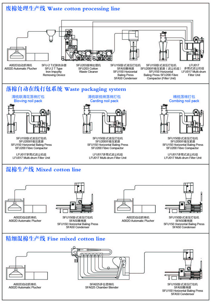 專(zhuān)業(yè)生產(chǎn)SFA系列開(kāi)清棉設(shè)備(包括老機(jī)改造)、SFU廢棉處理機(jī)系統(tǒng)設(shè)備、紡織除塵設(shè)備、及粗紗頭開(kāi)松機(jī)、立式臥式液壓打包